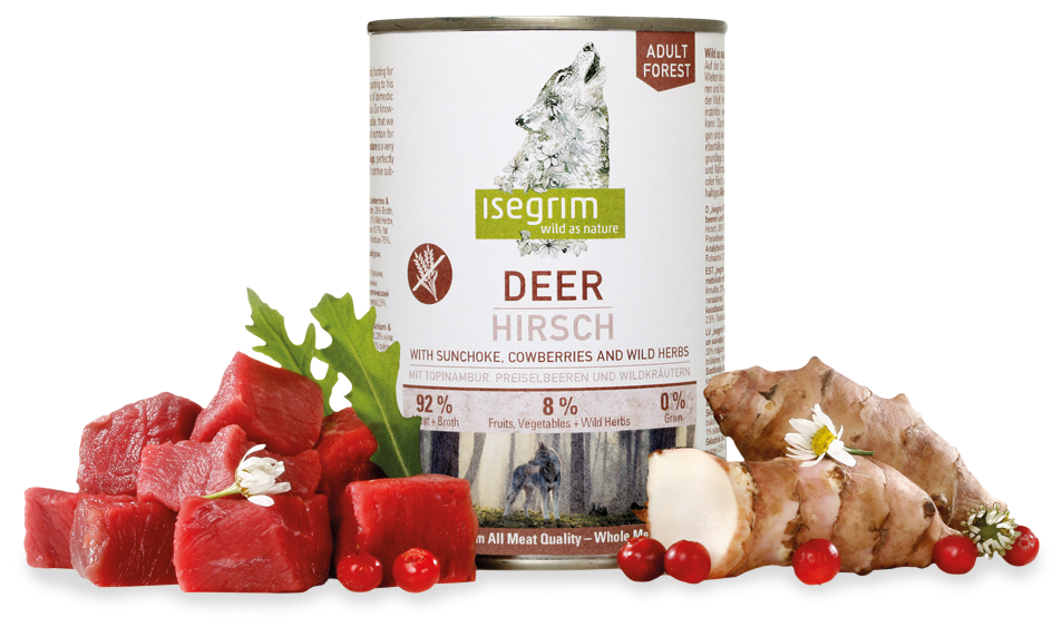 Speciální receptura obsahující čerstvé jelení a drůbeží maso je chutnou kombinací pro každodenní jídelníček. Přidání topinamburů (které obsahují inulin pro dobré zažívání) a brusinek (bohatých na vitamín C) zajišťuje, že váš pes dostává všechny potřebné vitamíny a minerály.